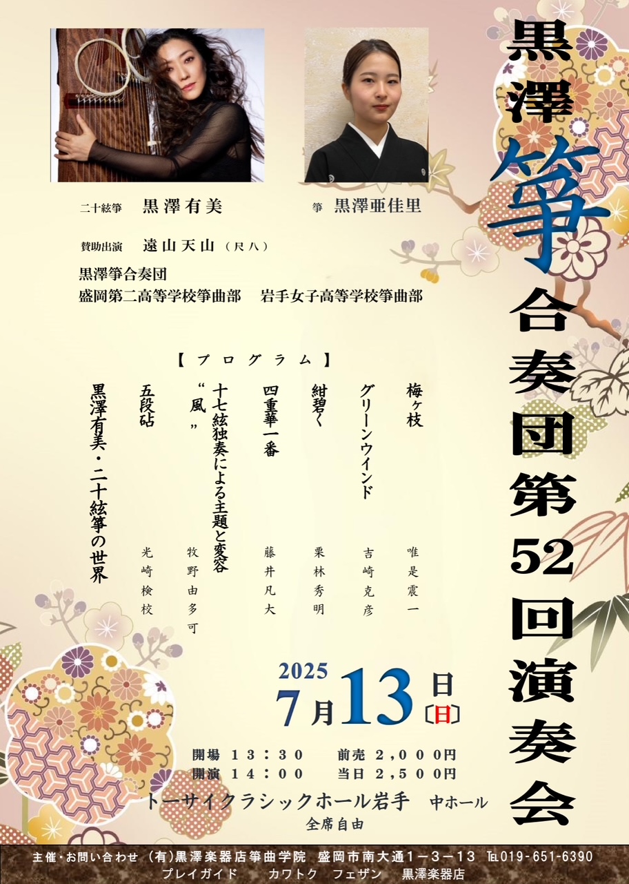 黒澤箏合奏団第50回演奏会 7月2日13:30会場、14時開演 岩手県民会館中ホール
